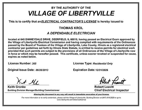 In 2008, he passed the IL state written exam and the physical skills test as well for a residential electrician's license. The test administrator/electrical inspector noted how well Tom performed as a first-time attendee of the test who was also the first to complete the written portion of the exam that day.